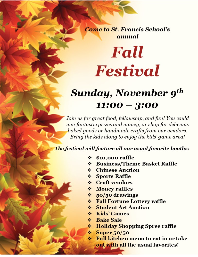 Our 2025 Fall Festival is scheduled for Sunday, November 9, 2025. The festival features many raffles and prizes, games for the kids, and delicious food too! Local crafters and vendors set up to sell their handmade items at the festival. The grand prize of the day is our $10,000 giveaway. Only 250 total tickets are sold, and the first ticket drawn wins $10,000. Then, five more tickets are drawn and they each win $500. Tickets can be purchased at the school or St. Francis Church offices, or buy tickets online at: https://www.zeffy.com/en-US/donation-form/fall-festival-dollar10000-raffle-nov-9–2025