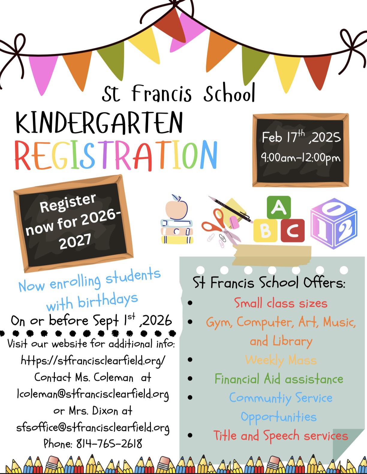 Call 814-765-2618 for more information or follow our Facebook page, St. Francis School, Clearfield https://www.facebook.com/SFSponies